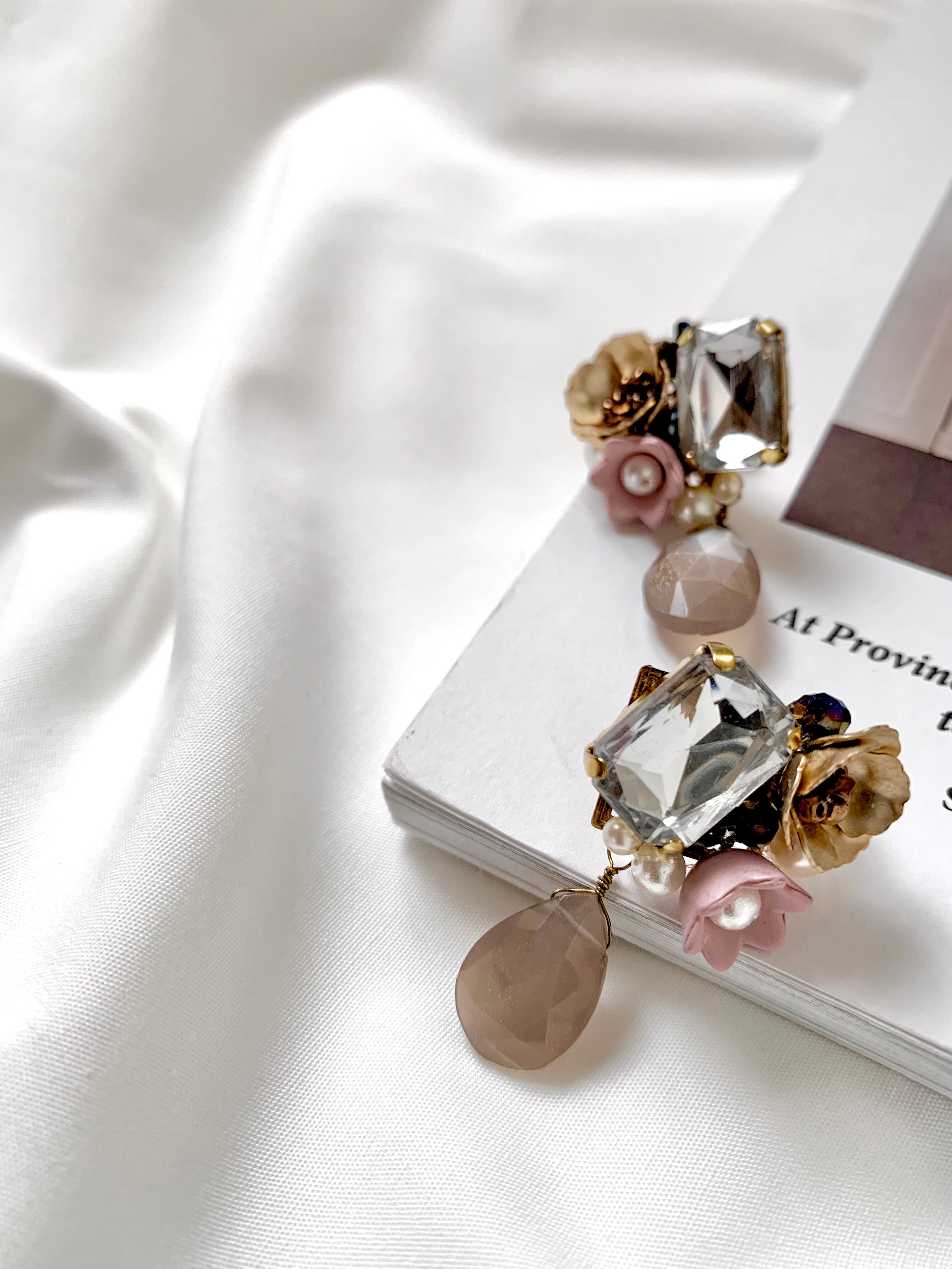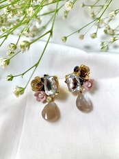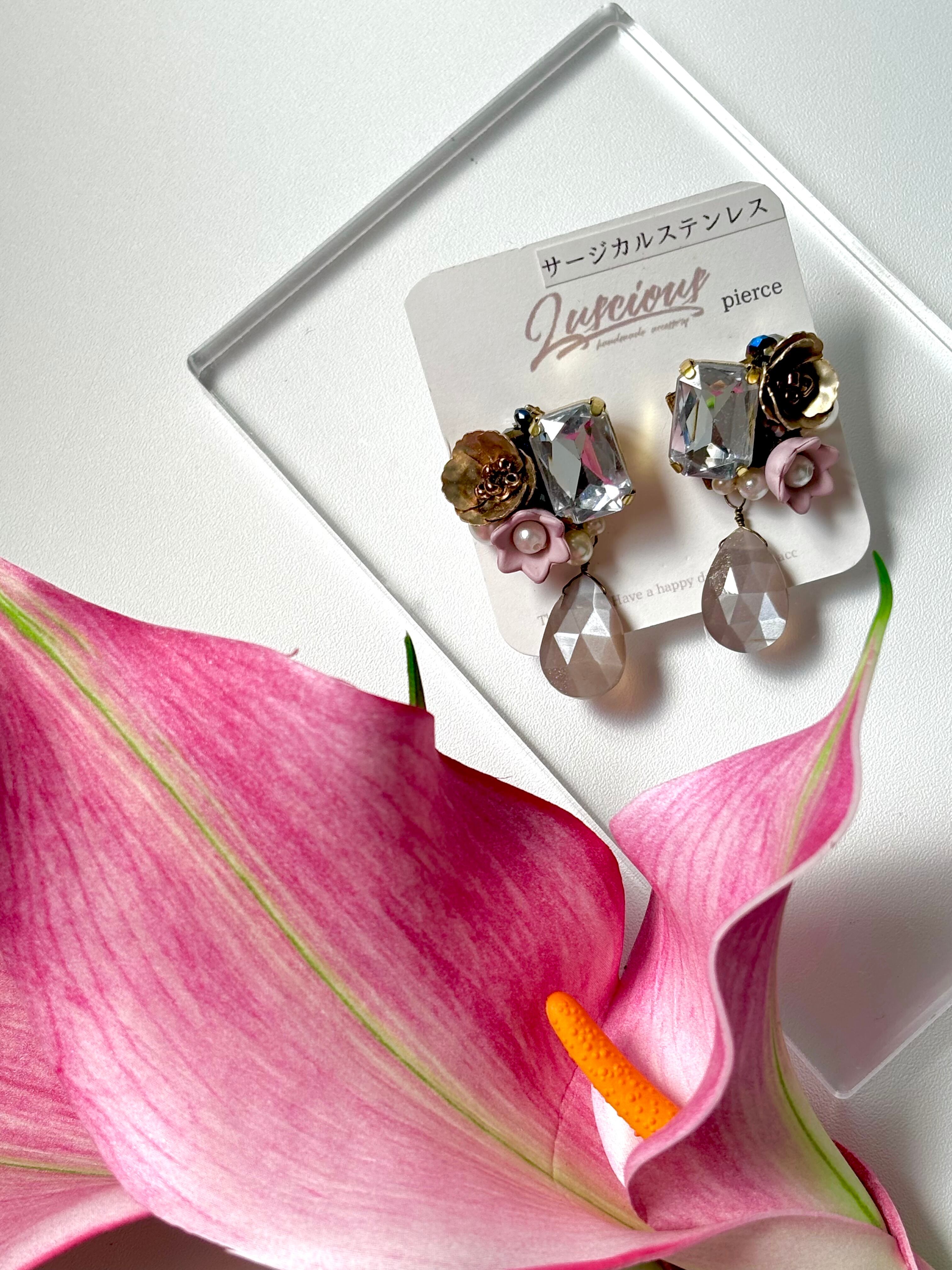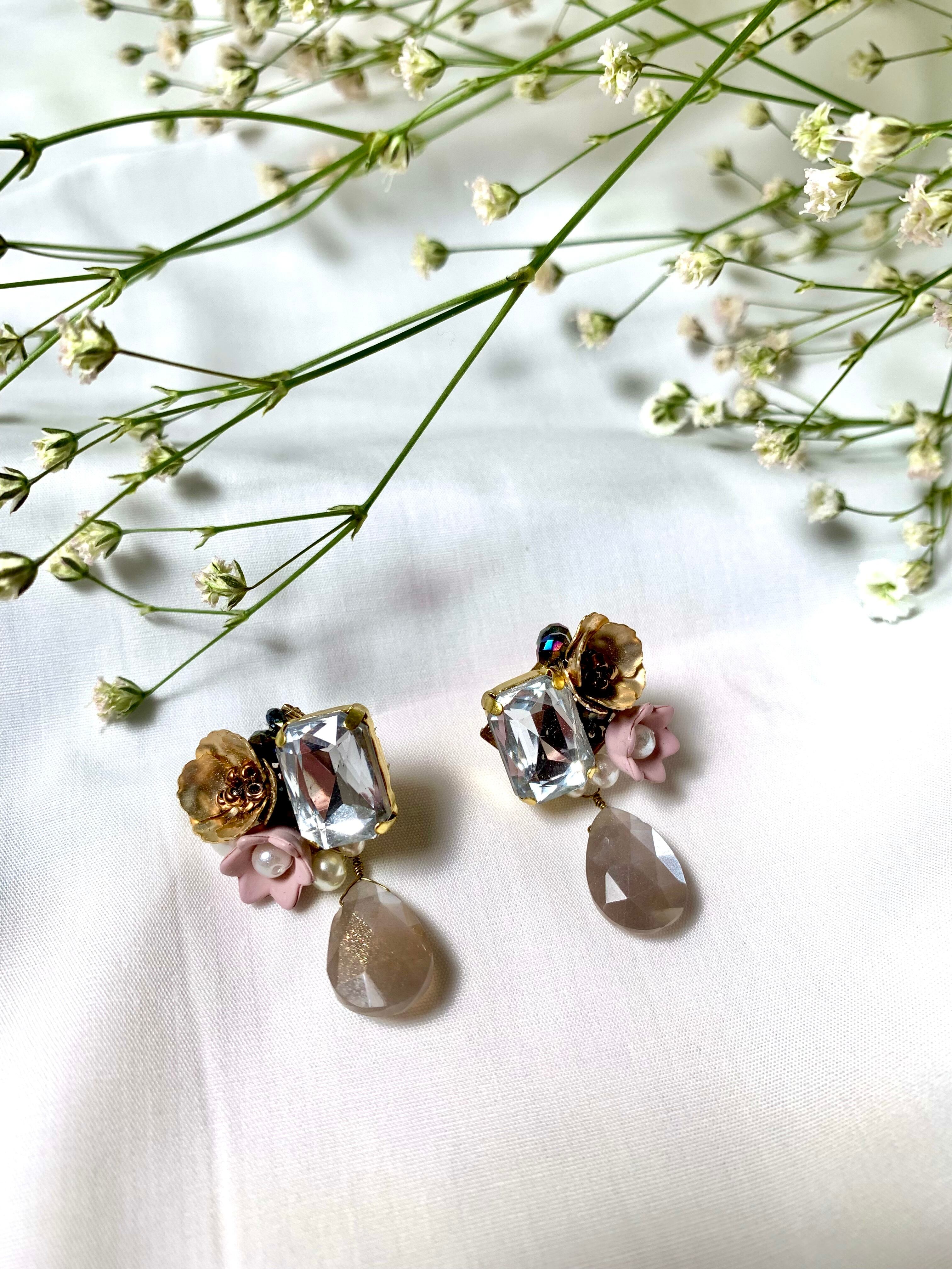 ゴールドフラワーにダスティーピンクのお花、クリアのビジューの組み合わせた可愛らしく、高級感があるアクセサリーです。