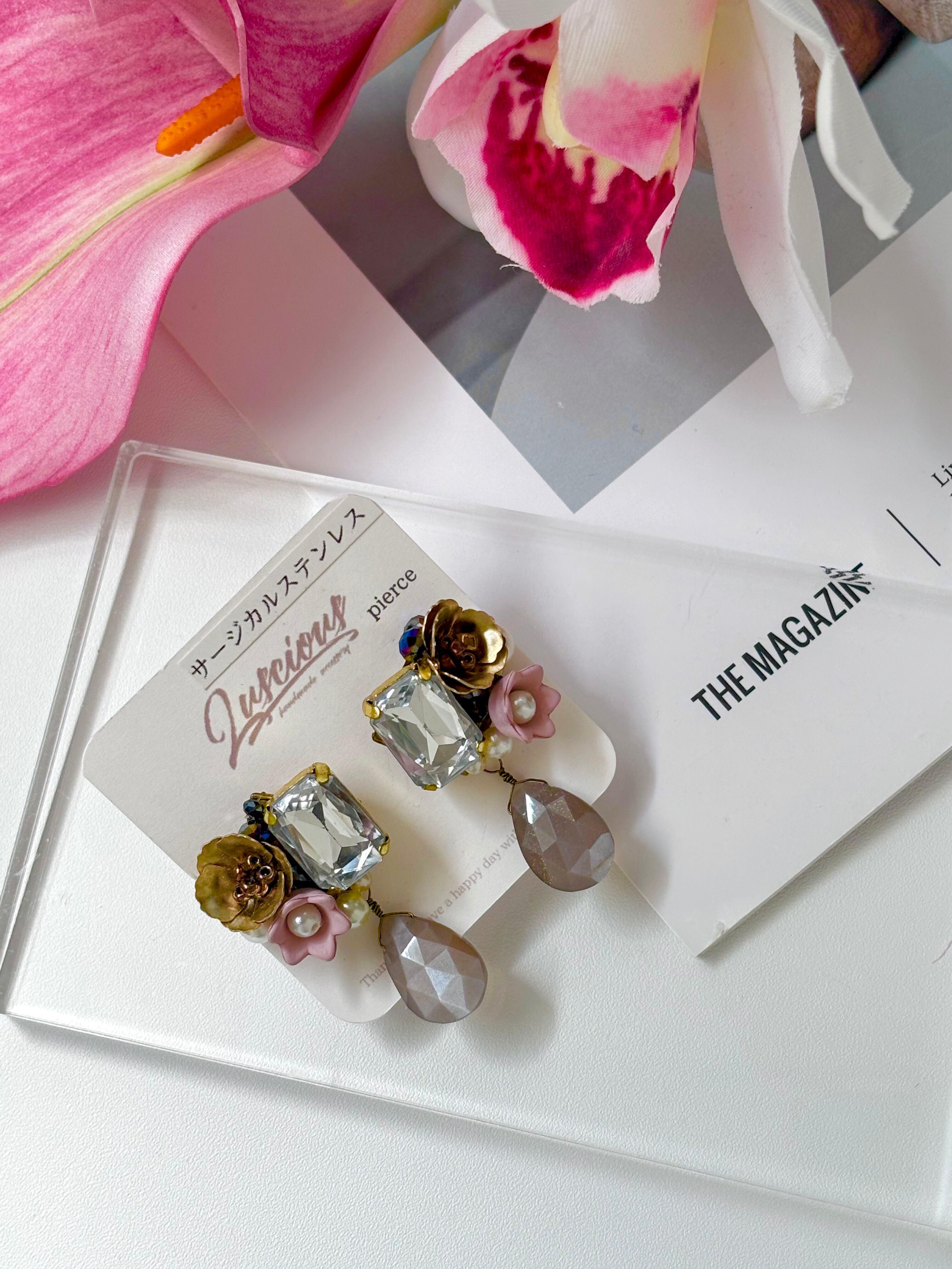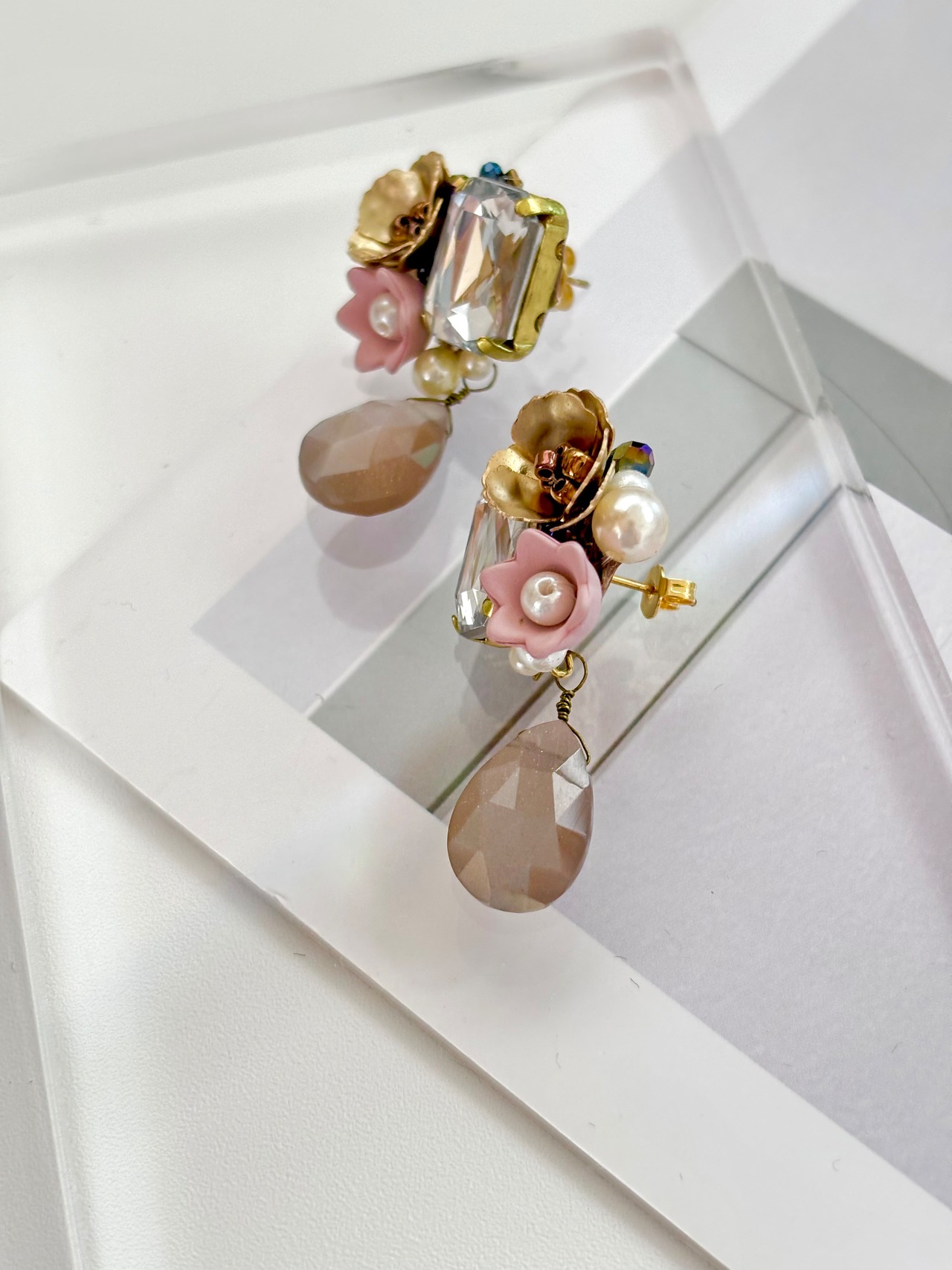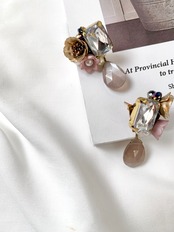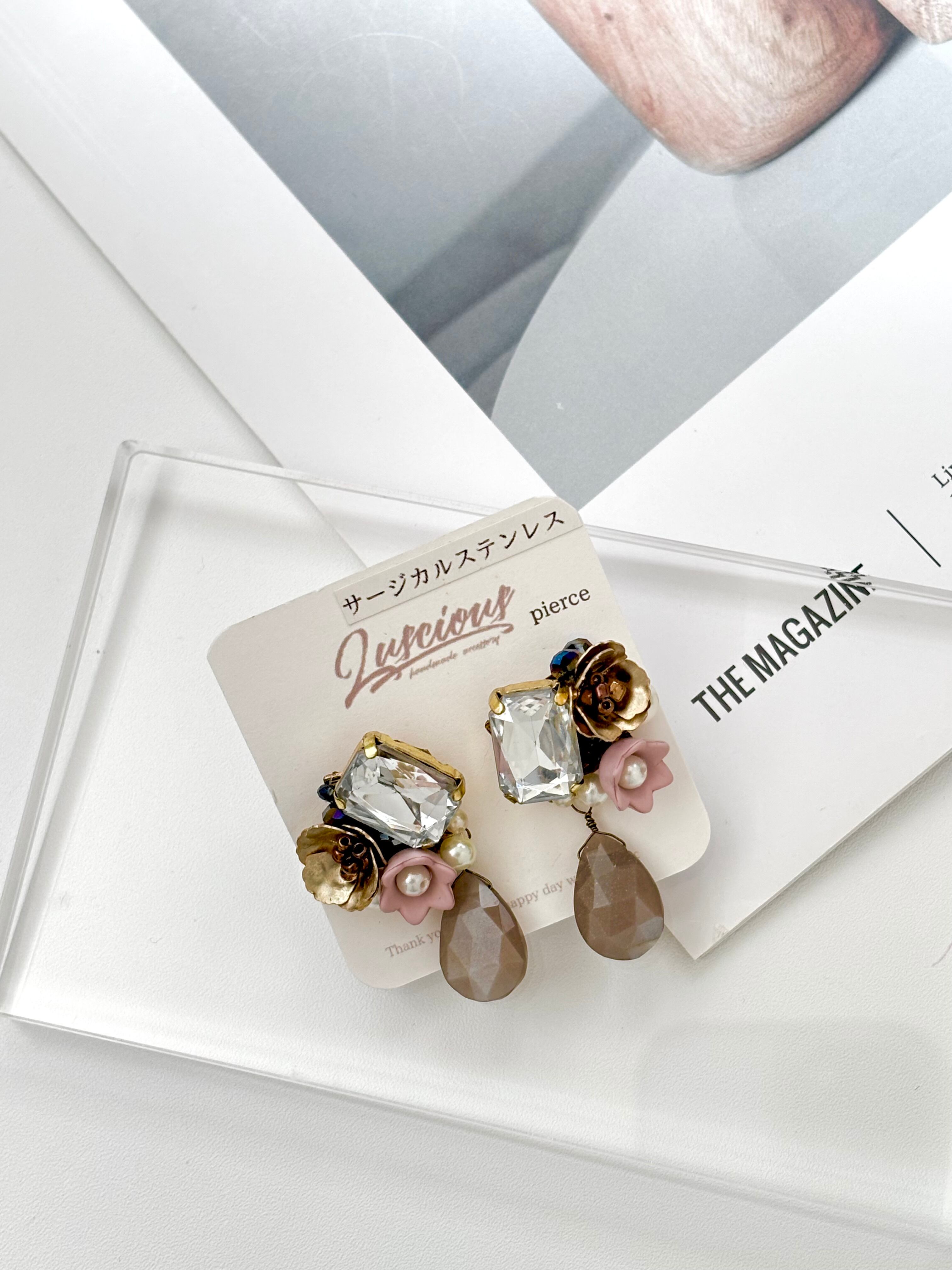 ゴールドフラワーにダスティーピンクのお花、クリアのビジューの組み合わせた可愛らしく、高級感があるアクセサリーです。